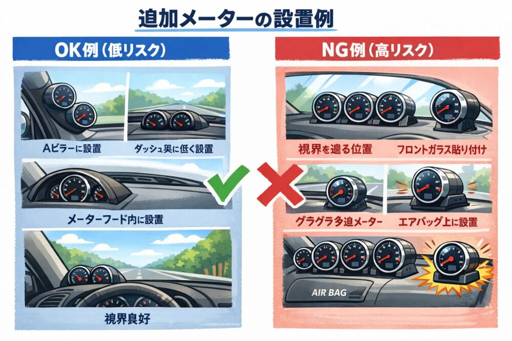 ダッシュボード上の追加メーターは条件次第で車検OKだが、配置や固定方法を間違えるとNG。