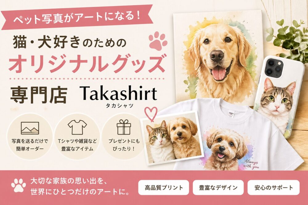 Takashirtは「ペットの写真をそのまま高品質なアートグッズにできる、コスパと満足度のバランスが良いサービス」です。